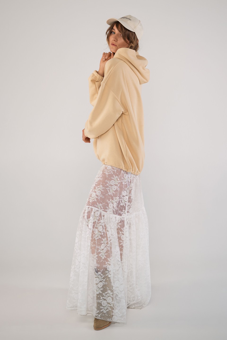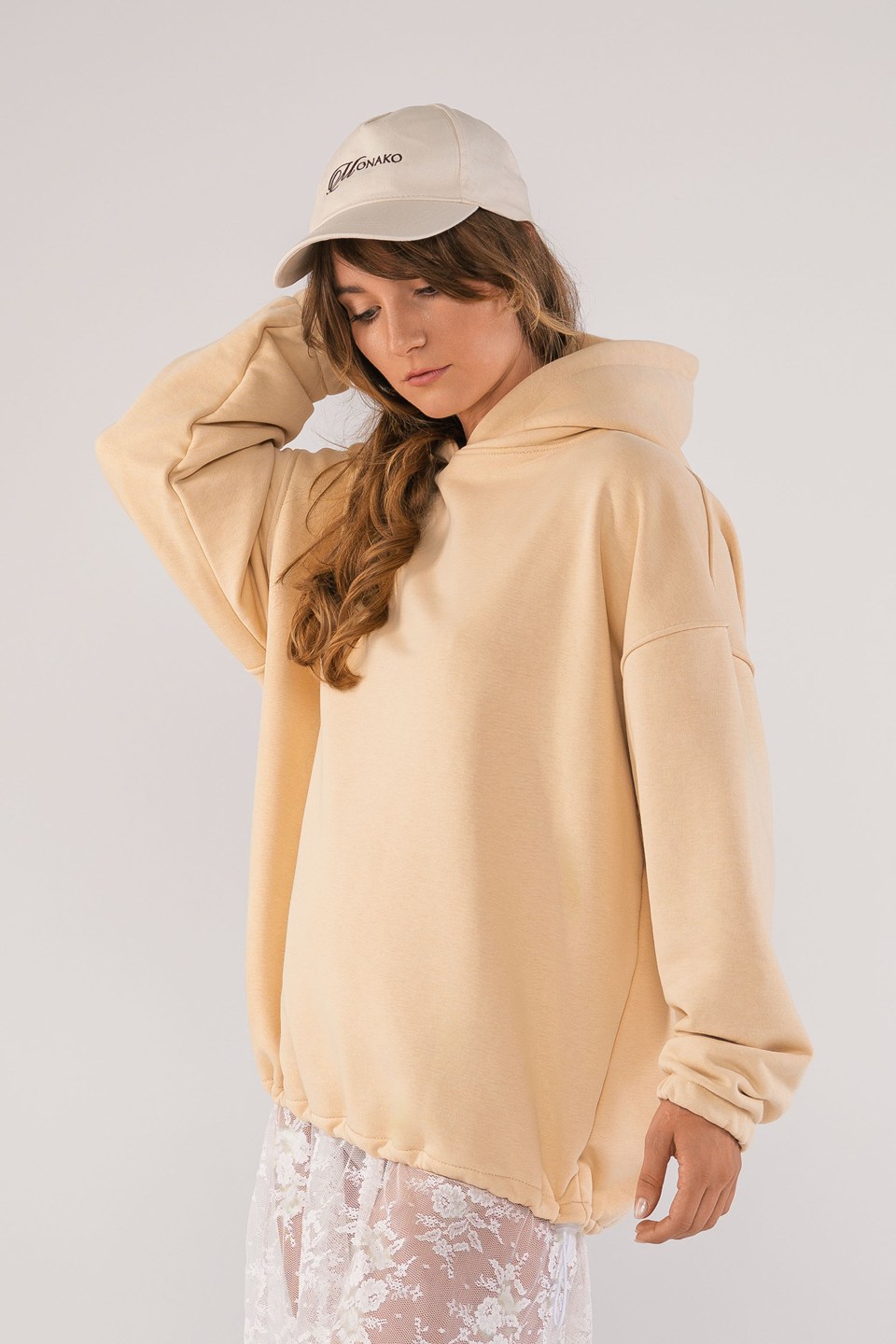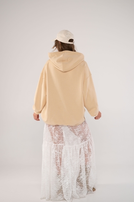 Низ изделия обработан кулиской с фиксаторами — это позволяет регулировать посадку и придаёт толстовке дополнительную функциональность. Рукава выполнены с притачной резинкой, что придаёт им аккуратный и законченный вид.
