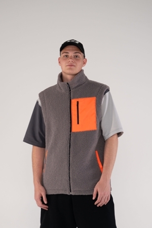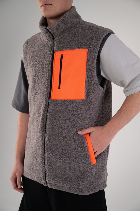 На левой полочке расположен накладной контрастный карман на молнии из плащевой ткани — это не только функциональное, но и визуально выразительное решение, может быть выполнен в различных цветах с нанесением вашего логотипа. Дополнительно жилет оснащён практичными прорезными карманами с контрастной листочкой из плащевой ткани, что подчёркивает его стиль и удобство.