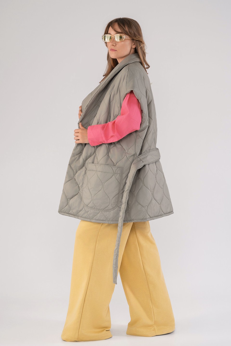 Особенность модели — застёжка на запах, как у кимоно, с отлетным поясом на двух втачных шлевках в боковых швах на уровне талии. Такая конструкция позволяет регулировать посадку и подчёркивает силуэт.