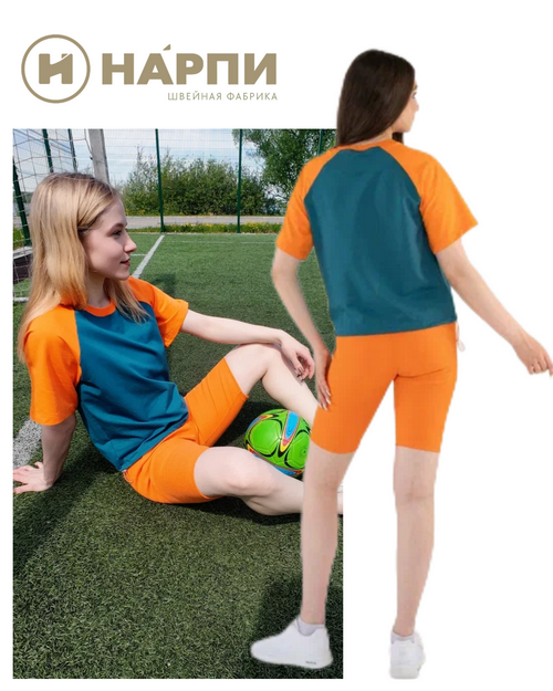 Образ состоит из укороченной футболки реглан и велосипедок. К такому образу можно добавить шорты с контрастным кантом из новой коллекции Нарпи и создать комплект тройку. Футболка может быть выполнена в одном цвете или сочетать разные оттенки, в зависимости от ваших предпочтений. Она может быть яркой, с принтами или лого — главное, чтобы подходила под ваш корпоративный стиль.